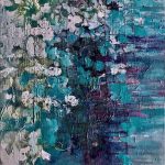 These blue tiles reminiscent of Safavid Tiles ,that evoke a sense of cultural heritage and history, linking the viewer to past memories. The inclusion of the patal flower, symbolizing fragility and memory, adds another layer of meaning to the piece. Just as the translucent white flowers in the painting blend delicately into the vibrant background, the patal flower embodies the transient nature of beauty and the fleeting moments we cherish. Together, these elements enhance combination of Grid and Turquoise color brings forth a layered narrative—one that celebrates the beauty of memory while acknowledging what is transient.