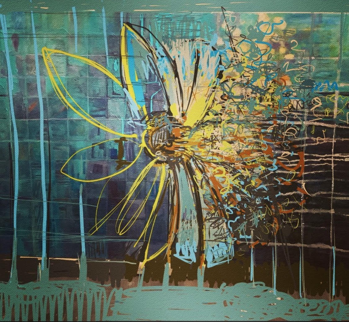 Yellw flower transitions into a chaotic arrangement of lines and shapes, which may symbolize decay or transtormation, suggesting a narrative of changes. symbolizing fragility and memory, adds another layer of meaning to the piece. Just as the translucent blue flowers in the painting blend delicately into the vibrant background, the patal flower embodies the transient nature of beauty and the fleeting moments we cherish.